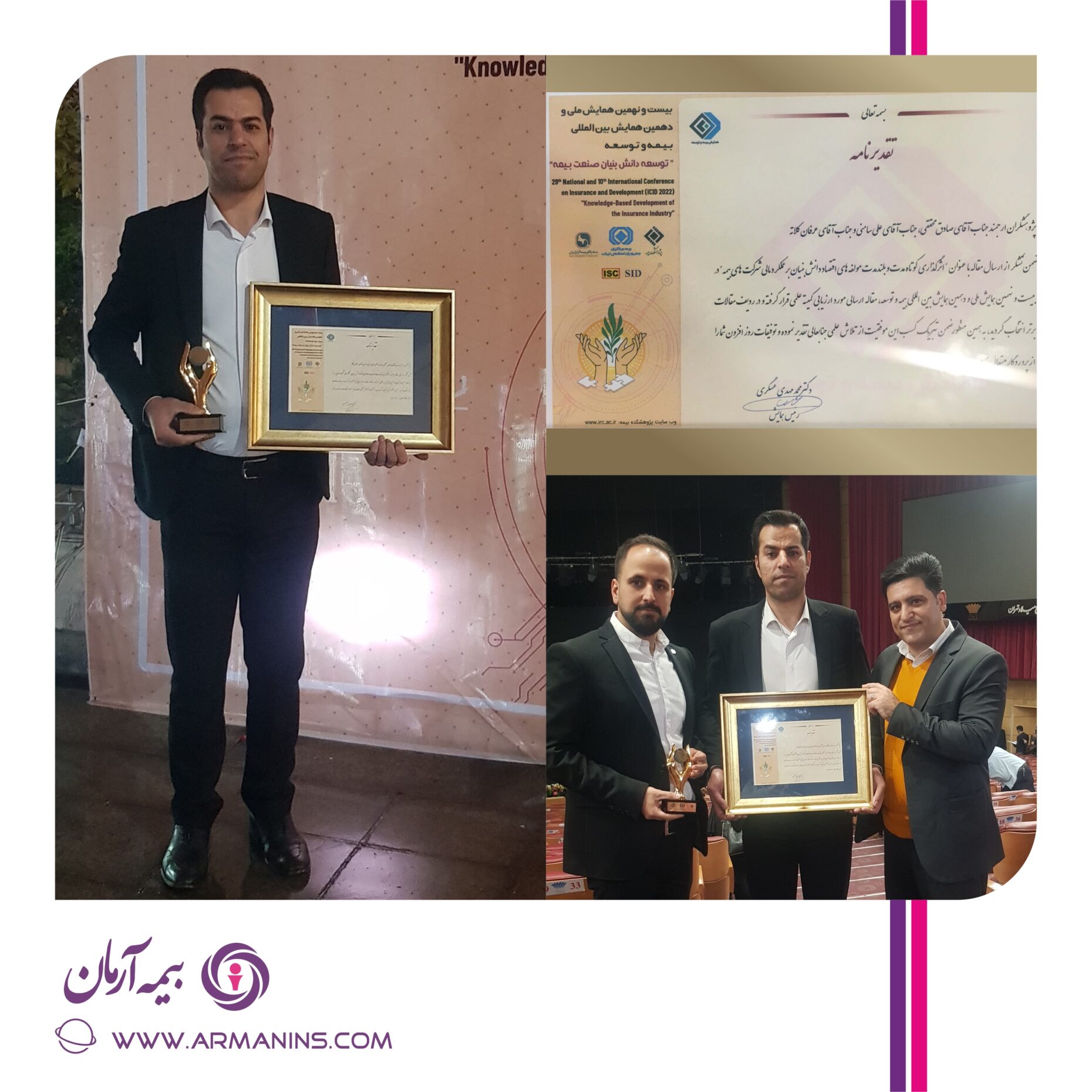 در بیست و نهمین همایش ملی و دهمین همایش بین المللی بیمه و توسعه که در روز بیمه برگزار شد، از علی سامنی مدیر بیمه های مسئولیت و مهندسی بیمه آرمان و صادق محققی رئیس اداره خسارت بیمه های مسئولیت بیمه آرمان برای سخنرانی و ارائه مقاله برتر تقدیر بعمل آمد.