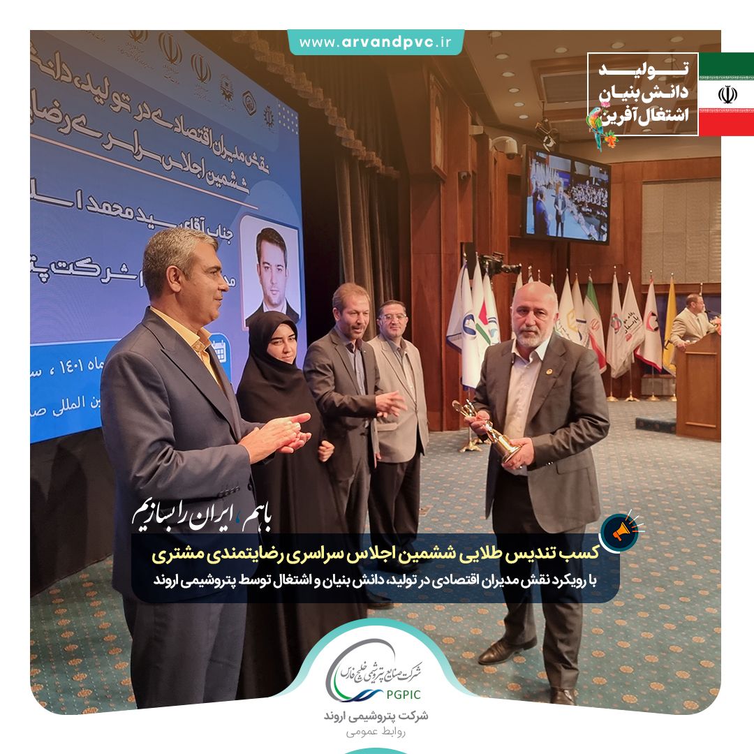 به گزارش شمانیوز و به نقل از روابط عمومی شرکت پتروشیمی اروند، این اجلاس سراسری که با مشارکت وزارتخانههای نفت، راه و شهرسازی، ارتباطات و فناوری اطلاعات، آموزش و پرورش، میراث فرهنگی، ورزش و جوانان، دانشگاه شهید بهشتی، سازمان ملی بهرهوری، سازمان مدیریت صنعتی و سازمان تامین اجتماعی در مرکز همایش های صدا و سیما برگزار شد، شرکت پتروشیمی اروند از سوی داوران به عنوان شرکت برتر در حوزه رضایتمندی مشتری با رویکرد نقش مدیران اقتصادی در تولید، دانش بنیان و اشتغال انتخاب و با اهدای تندیس طلایی از افشین کیانی سرپرست شرکت پتروشیمی اروند تجلیل یه عمل آمد.