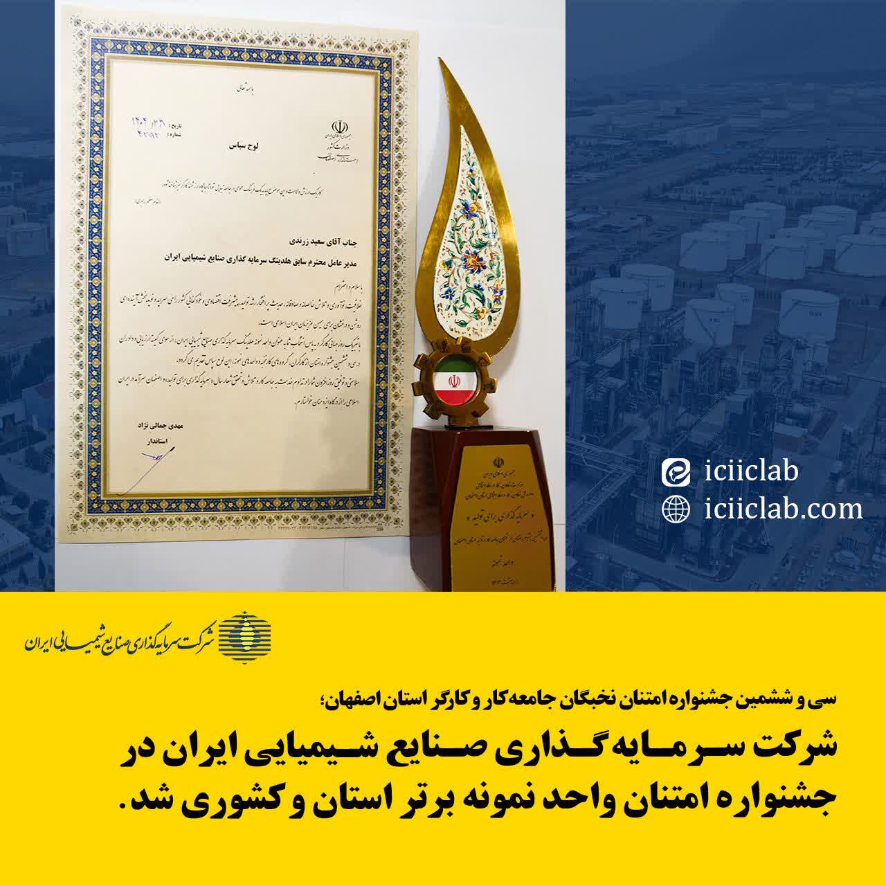 به گزارش شمانیوز به نقل از روابط عمومی شرکت سرمایه گذاری صنایع شیمیایی ایران؛ به مناسبت گرامیداشت هفته کار و کارگر سی و ششمین جشنواره امتنان نخبگان جامعه کار و تولید استان اصفهان صبح امروز با حضور مقامات و مسئولان محلی برگزار شد. براساس این گزارش در این مراسم که با حضور جناب آقایان جمالی نژاد استاندار اصفهان و دکتر محمدی معاون وزیر تعاون، کار و رفاه اجتماعی برگزار شد؛ که شرکت سرمایه گذاری صنایع شیمیایی ایران به عنوان واحد نمونه بخش صنعت استان معرفی شد و لوح تقدیرو تندیس دریافت کرد.